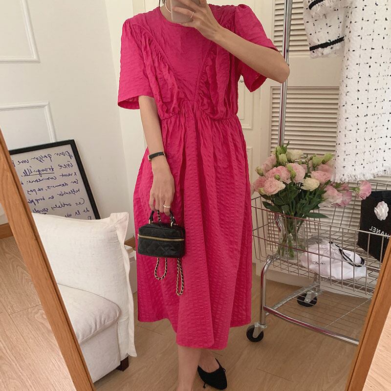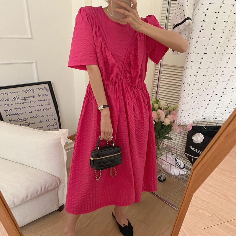 サマーレッドラウンドネックルーズドレス ロングスカート 夏物 Oネック 6/8 mi4689766403927