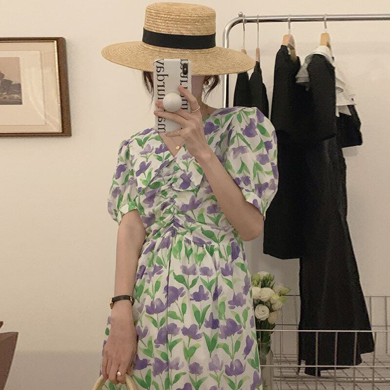 サマーVネックFlowerデザイン プリント柄ウェストスリムスリーブドレス 夏物 フラワーデザイン 6/8 mi4644121545028
