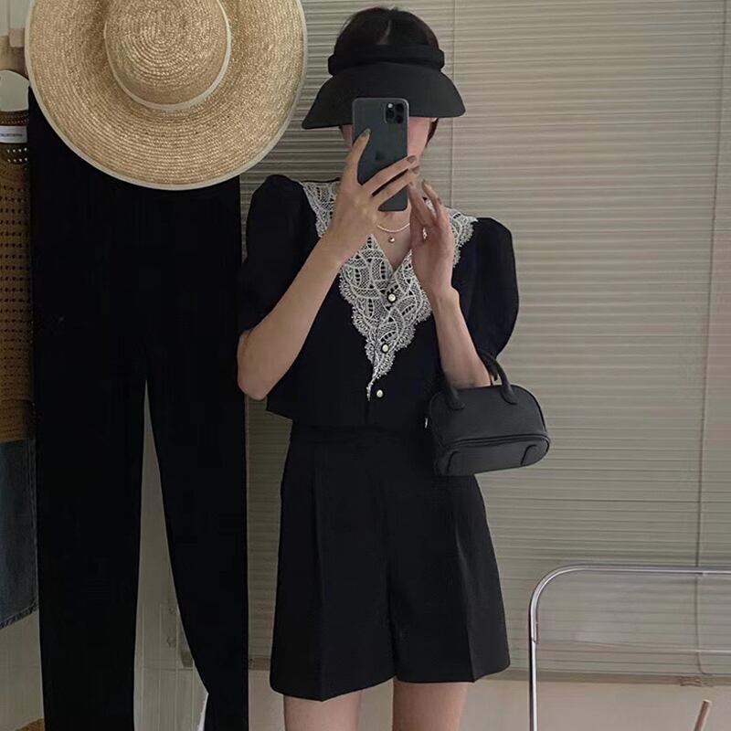 サマースタンダードVネックレーススリーブシャツ ハイウェストウェスト薄手ワイドレッグパンツ ショーツ レトロ 夏物 ブルマー ワイドパンツ 6/8 mi4664395367504