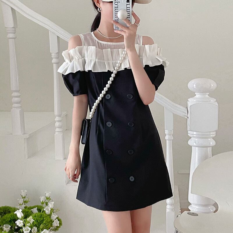 サマーラウンドネックメッシュダブルブレストスリーブAラインドレス 大人ガーリー スウィート キュート カジュアル 夏物 Oネック 6/8 mi4659758522698