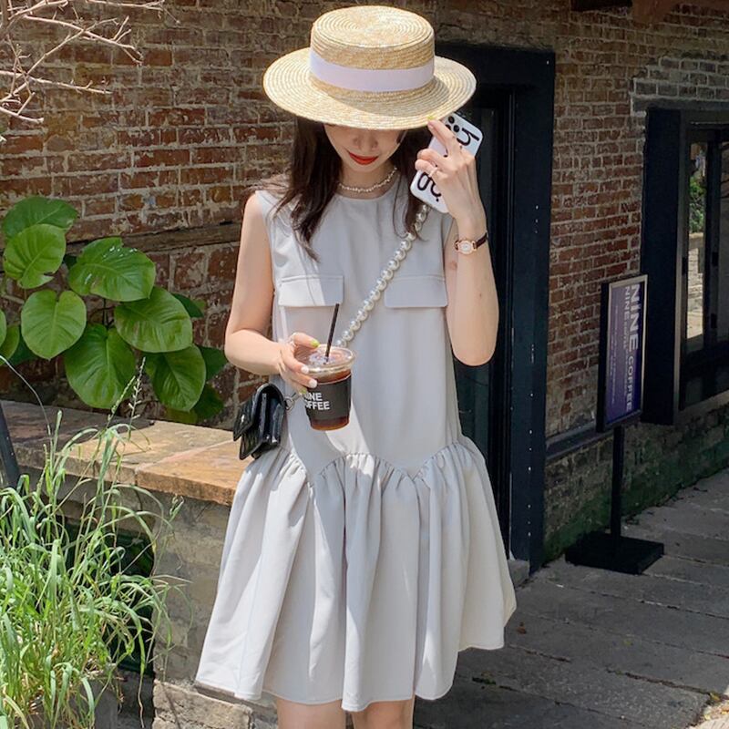 サマーラウンドネックポケットルーズプリーツノースリーブドレス 大人ガーリー スウィート キュート カジュアル 夏物 Oネック 6/8 mi4669768223355
