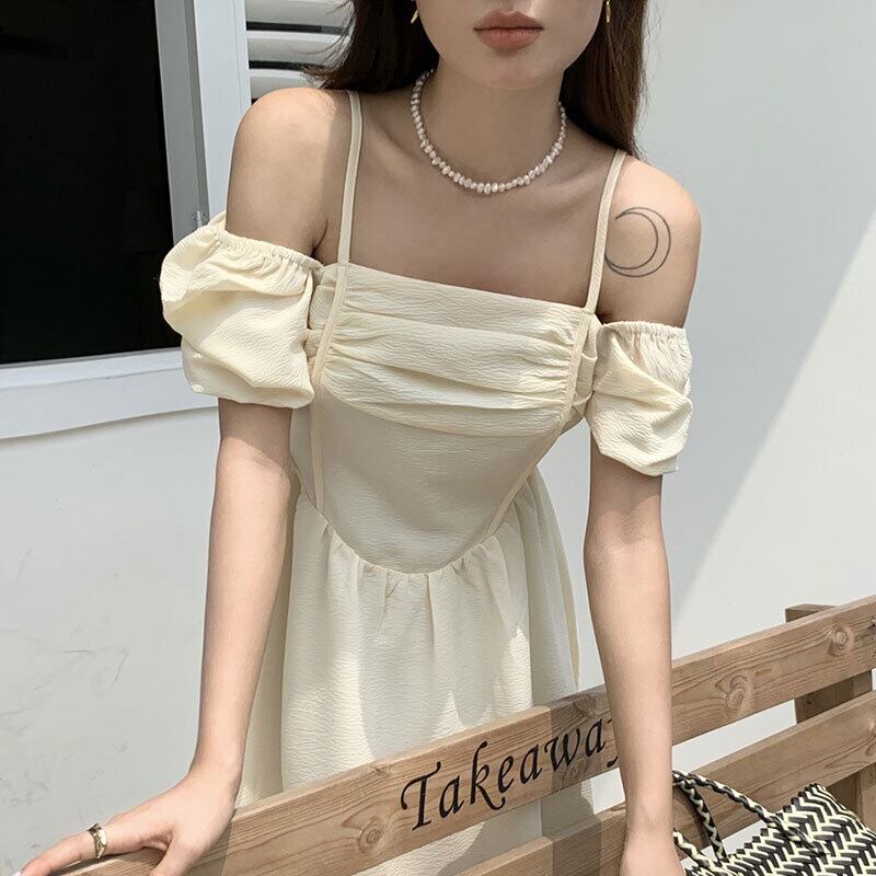 サマースタンダードカラーウェストスリムスリーブドレス ロングスカート レディース レトロ 夏物 6/8 mi467662860358