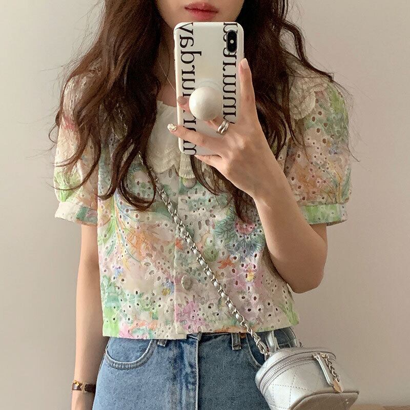 サマーカラーFlowerデザイン スリーブシャツ トップス レディース 夏物 フラワーデザイン ステッチ 6/8 mi4697476310749