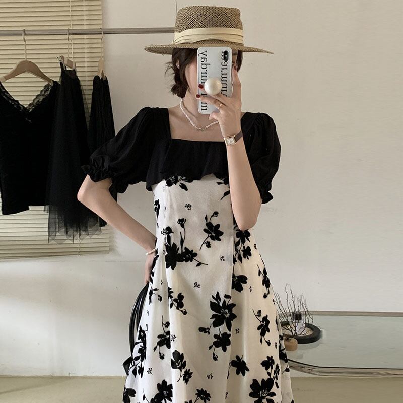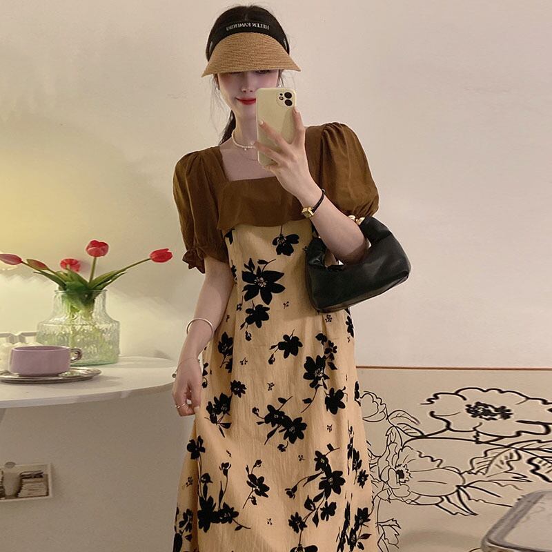 サマースタンダードカラースリーブフローラルドレス レトロ 夏物 花柄 スクウェア ステッチ 6/8 mi4627380242122