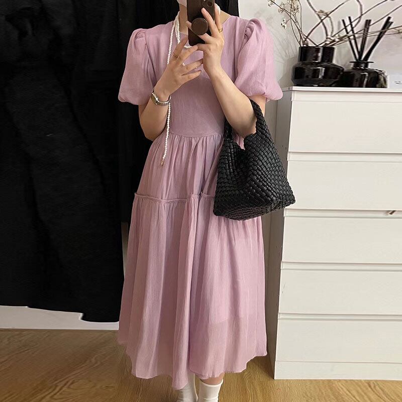サマーラウンドネックプリーツルーズカジュアルスリーブドレス ロングスカート ランタンスリーブ 大人ガーリー スウィート キュート 夏物 Oネック ステッチ 6/8 mi4666680440844