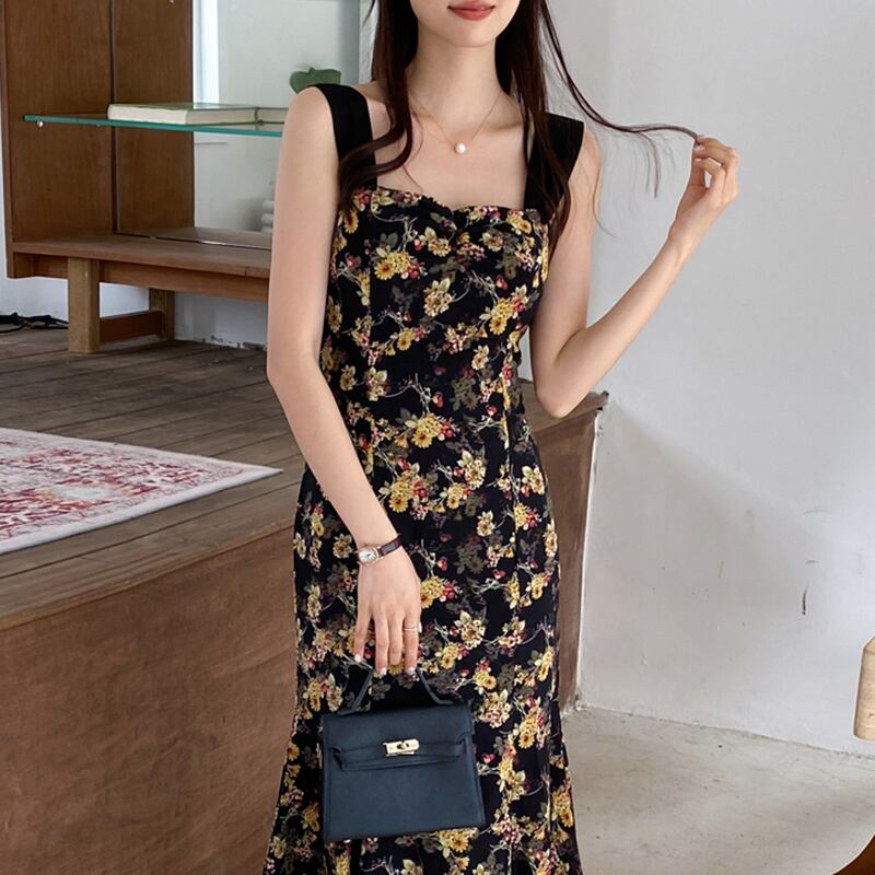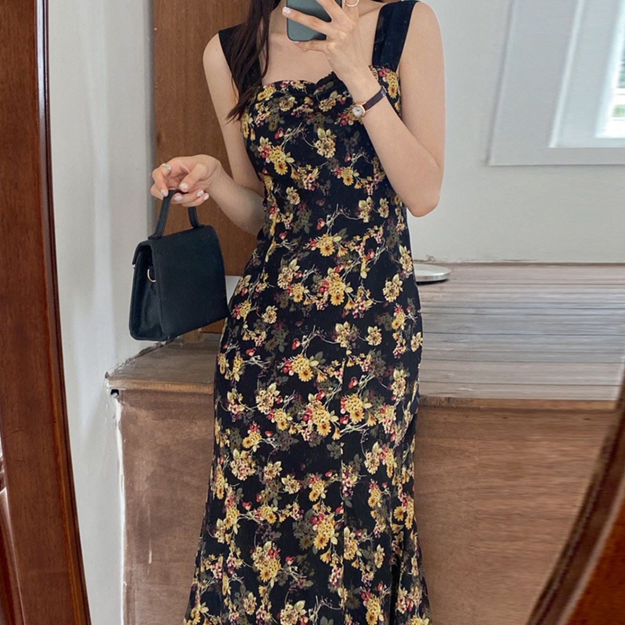 サマーカラーウェスト薄手ノースリーブFlowerデザイン ドレス ロングスカート レディース エレガント 夏物 フラワーデザイン スクウェア 6/8 mi4684013178175
