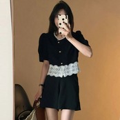 サマースタンダードラウンドネックレースFlowerデザイン ショートコート ハイウェストウェストAラインスカート レディース レトロ エレガント 夏物 Oネック フラワーデザイン 6/8 mi4699263986167