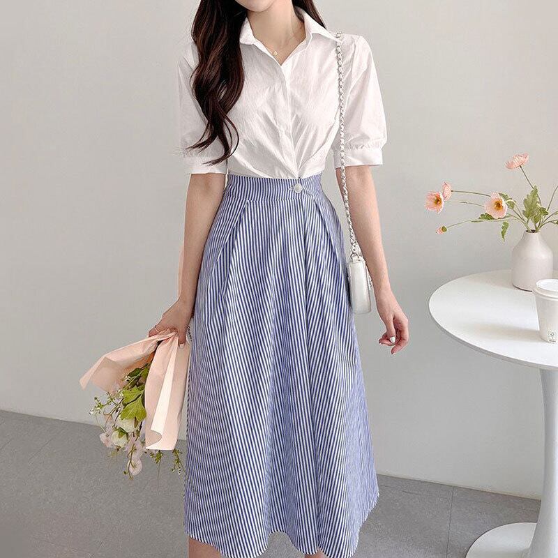 サマーストライプボタンウェストシャツ ドレス レディース 夏物 ステッチ 6/8 mi469018920599