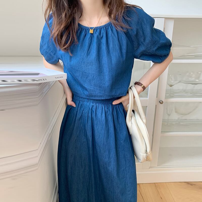 ブルーラウンドネックホルターショートトップス ハイウェストウェストスリムスカート レディース レース Oネック レースアップ 6/8 mi4657439718748