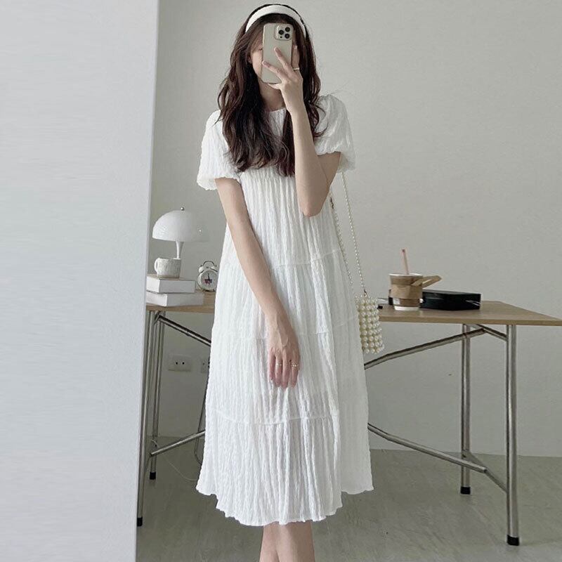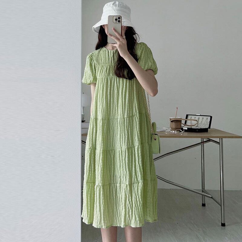 サマーラウンドネックプリーツルーズスリーブドレス レッド ランタンスリーブ 夏物 Oネック 6/8 mi4628790326053