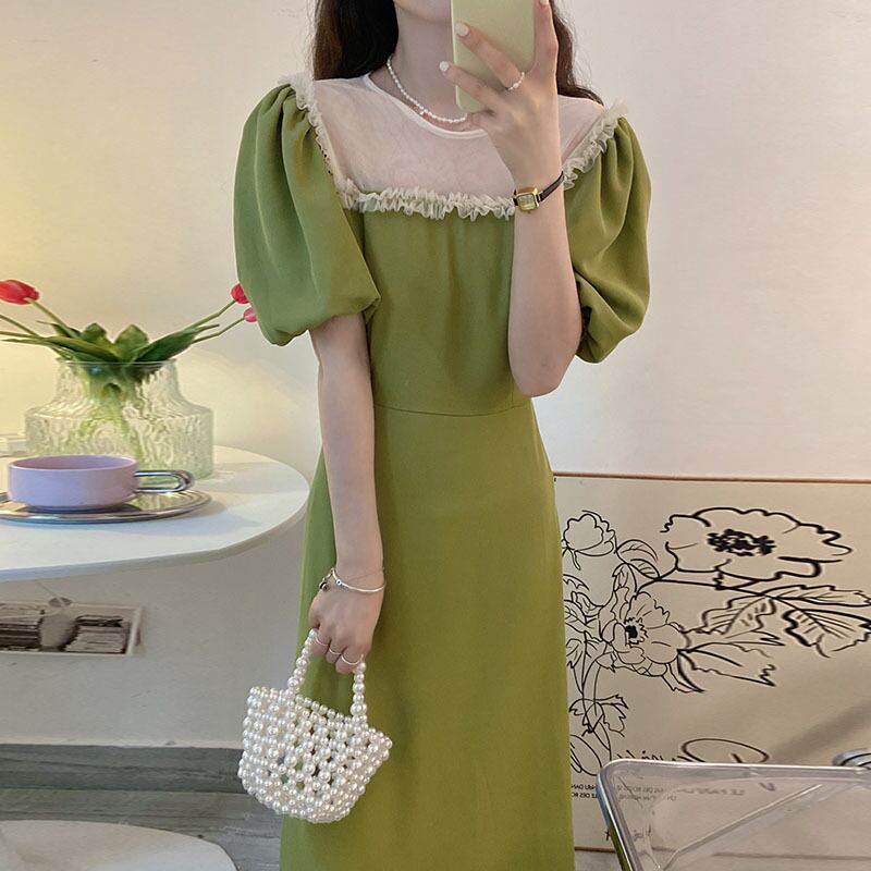 サマースタンダードラウンドネックメッシュウェストスリムスリーブドレス ロングスカート レディース レトロ 夏物 Oネック ステッチ 6/8 mi4656287289505