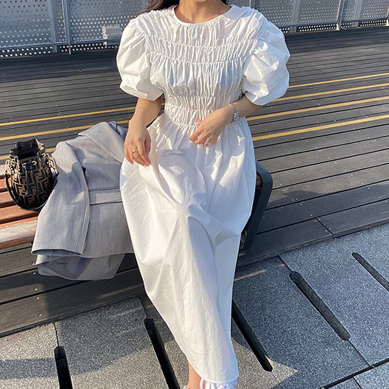 サマースタンダードラウンドネックウェストスリムスリーブロングドレス レトロ 夏物 Oネック 6/8 mi4673360682825