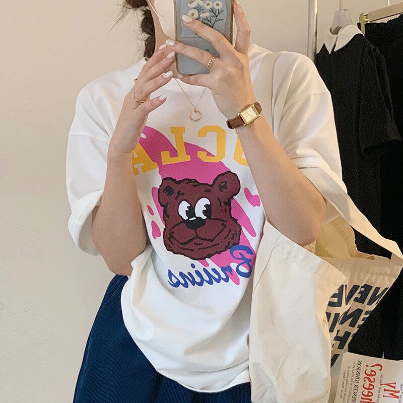 サマーラウンドネックルーズカジュアルプリント柄ホワイトTシャツ トップス レディース 夏物 Oネック 6/8 mi4691671315151