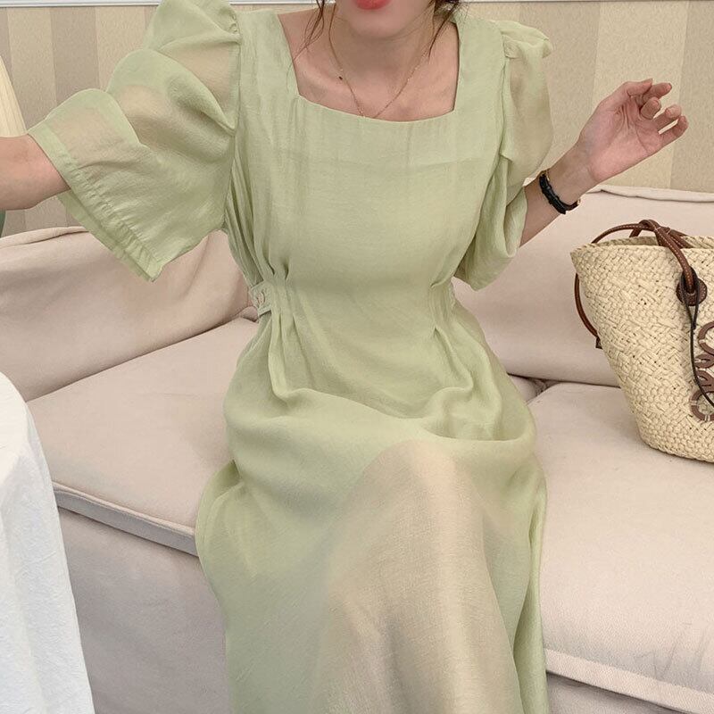 サマースタンダードカラーボタンウェスト薄手スリーブドレス ロングスカート レディース レトロ 夏物 スクウェア 6/8 mi4664455453562