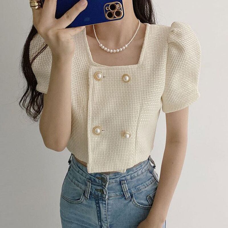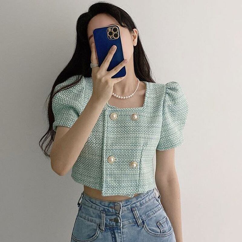 サマースタンダードカラーパールダブルブレスト格子柄ツィードスリーブショートジャケット レトロ 夏物 真珠 スクウェア 6/8 mi4625586012601