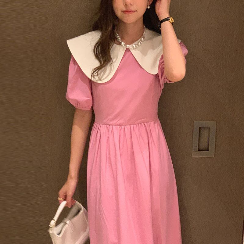 サマーカラーウェスト薄手スリーブドレス ロングスカート 大人ガーリー スウィート キュート カジュアル 夏物 6/8 mi46874872636