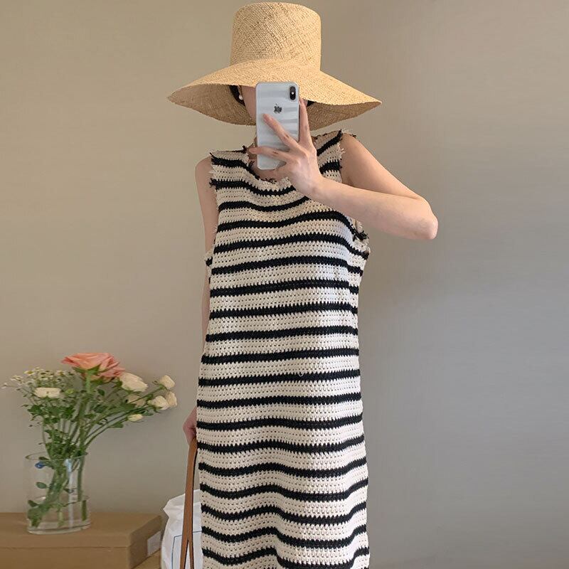サマースタンダードラウンドネックストライプジャカードノースリーブニットドレス レトロ 夏物 Oネック 6/8 mi463833413065