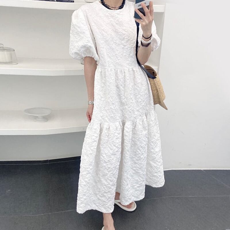 サマースタンダードラウンドネックFlowerデザイン ルーズスリーブドレス ロングスカート レトロ 夏物 Oネック フラワーデザイン 6/8 mi4620615974562