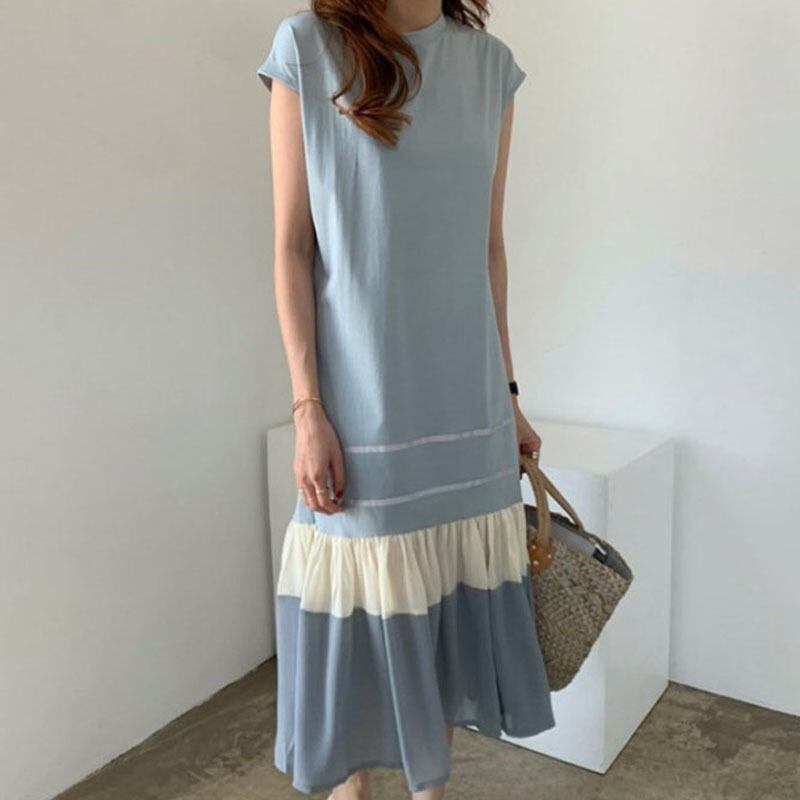サマーラウンドネックルーズカラーノースリーブドレス 夏物 Oネック ステッチ 6/8 mi4622724705352