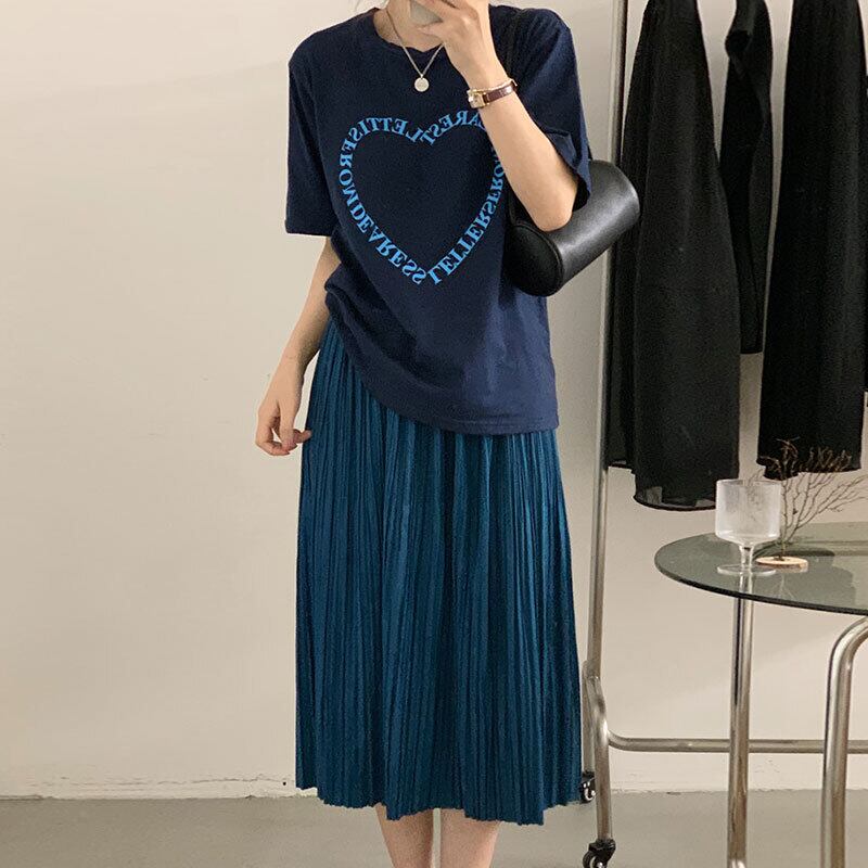 サマーラウンドネックプリントTシャツ ハイウェストウェストプリーツスカート 夏物 Oネック 6/8 mi4658390783791