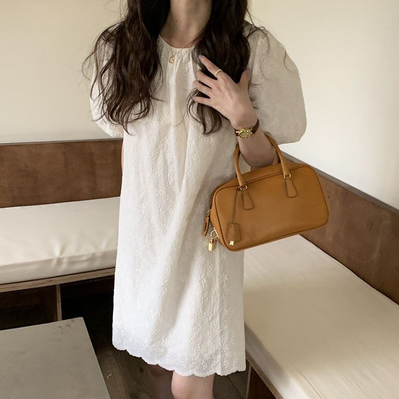 サマーラウンドネック刺繍Flowerデザイン ルーズスリーブソリッド カラードレス 夏物 Oネック ソリッドカラー フラワーデザイン 6/8 mi461119961877