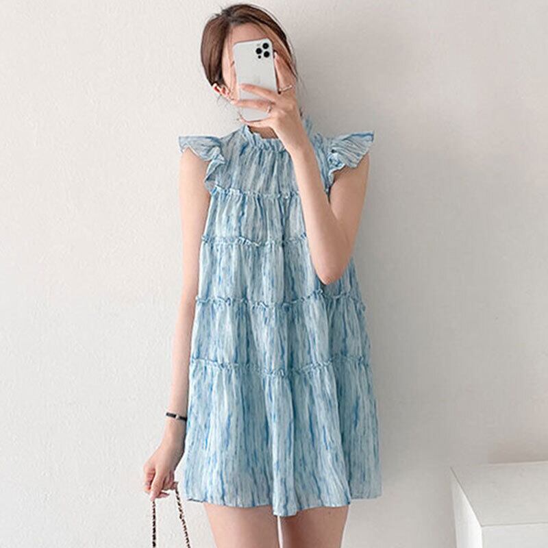 サマーラウンドネックプリントスリーブシフォンドレス 夏物 Oネック ステッチ 6/8 mi4677995500519