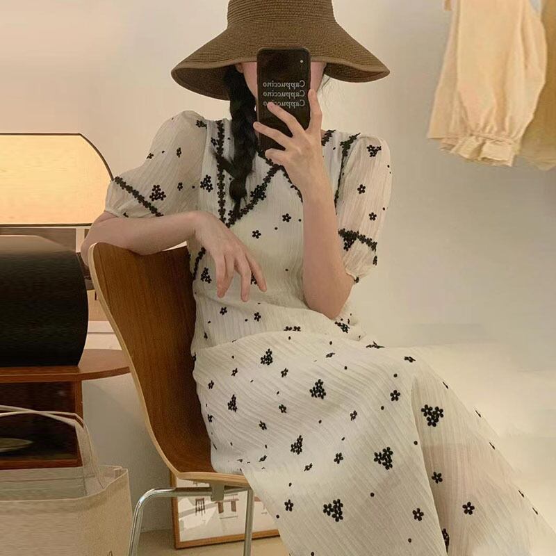 サマーラウンドネックウェスト薄手Flowerデザイン スリーブドレス エレガント 夏物 Oネック フラワーデザイン 6/8 mi4617904024075