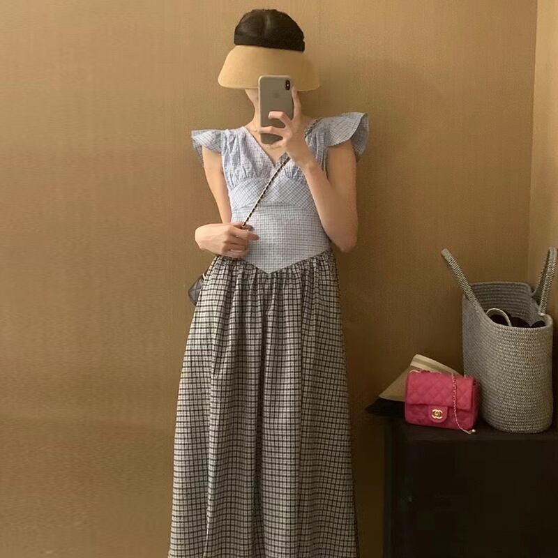 サマーVネックカラー格子柄ウェストスリーブドレス エレガント 夏物 ステッチ 6/8 mi4647095769168