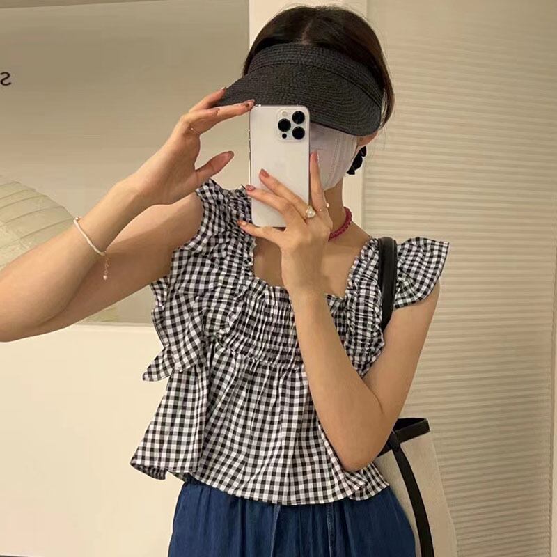 サマースタンダードカラールーズショートスリーブ格子柄シャツ トップス レディース レトロ 夏物 スクウェア 6/8 mi4682204216599