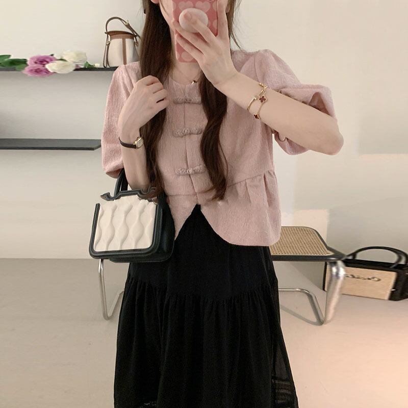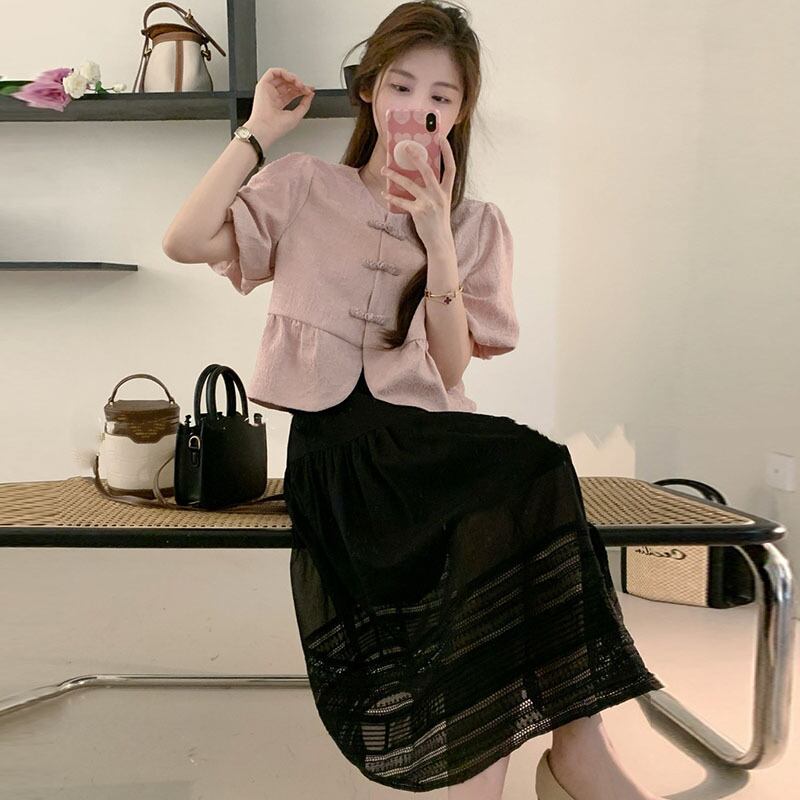 サマーラウンドネックスリーブシャツ ハイウェストウェストプリーツルーズスカート 夏物 Oネック 6/8 mi4611179100054