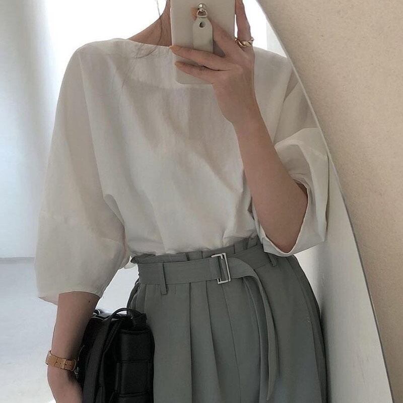 サマーラウンドネックルーズソリッド カラーシャツ トップス レディース 夏物 Oネック ソリッドカラー 6/8 mi4687407901225