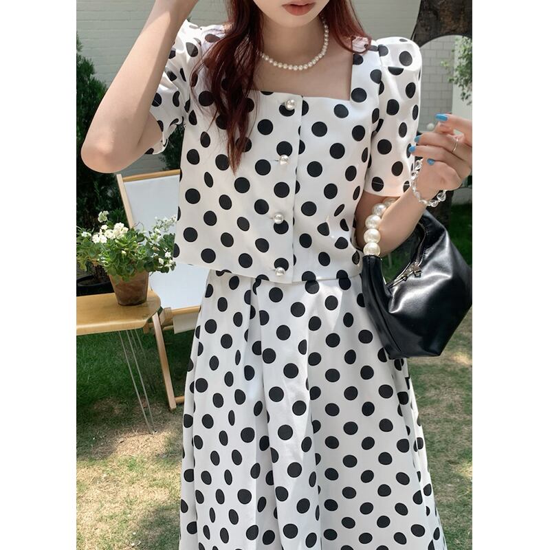 サマーカラー水玉シャツ ハイウェストウェストスカート レディース 夏物 スクウェア 6/8 mi4612772580659