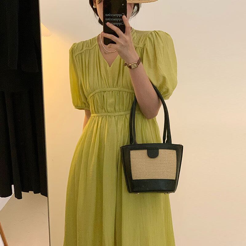 サマーVネックプリーツウェストスリムスリーブドレス ロングスカート レディース エレガント 夏物 6/8 mi4693845837421