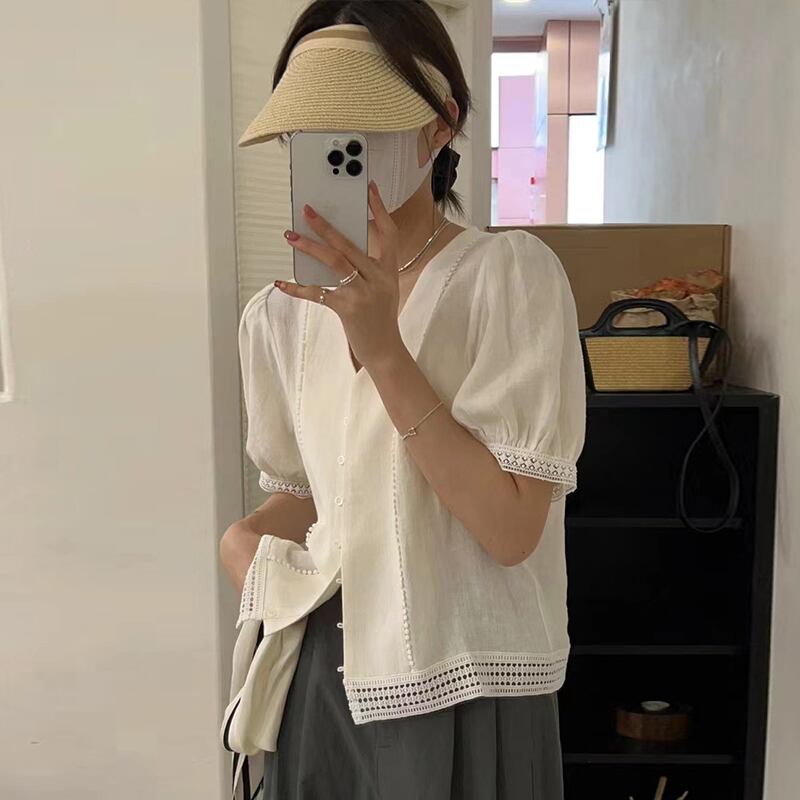 サマーVネックレースFlowerデザイン ルーズスリーブシャツ レディース 夏物 フラワーデザイン ステッチ 6/8 mi4651469990377