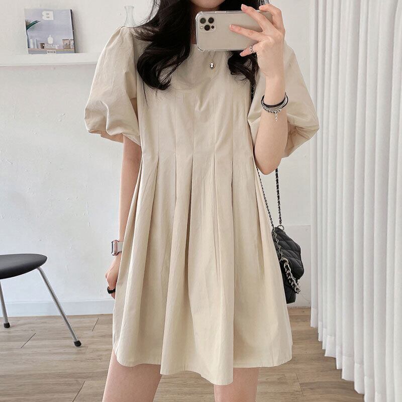 サマーラウンドネックプリーツウェストスリムスリーブドレス ショートスカート ランタンスリーブ 夏物 Oネック 6/8 mi4642257441246