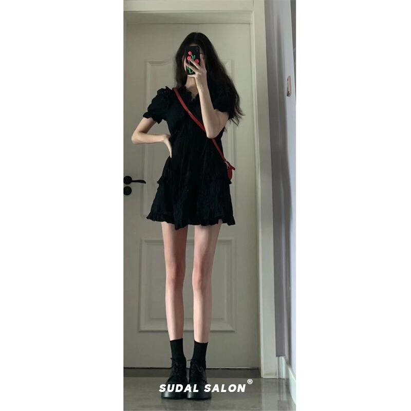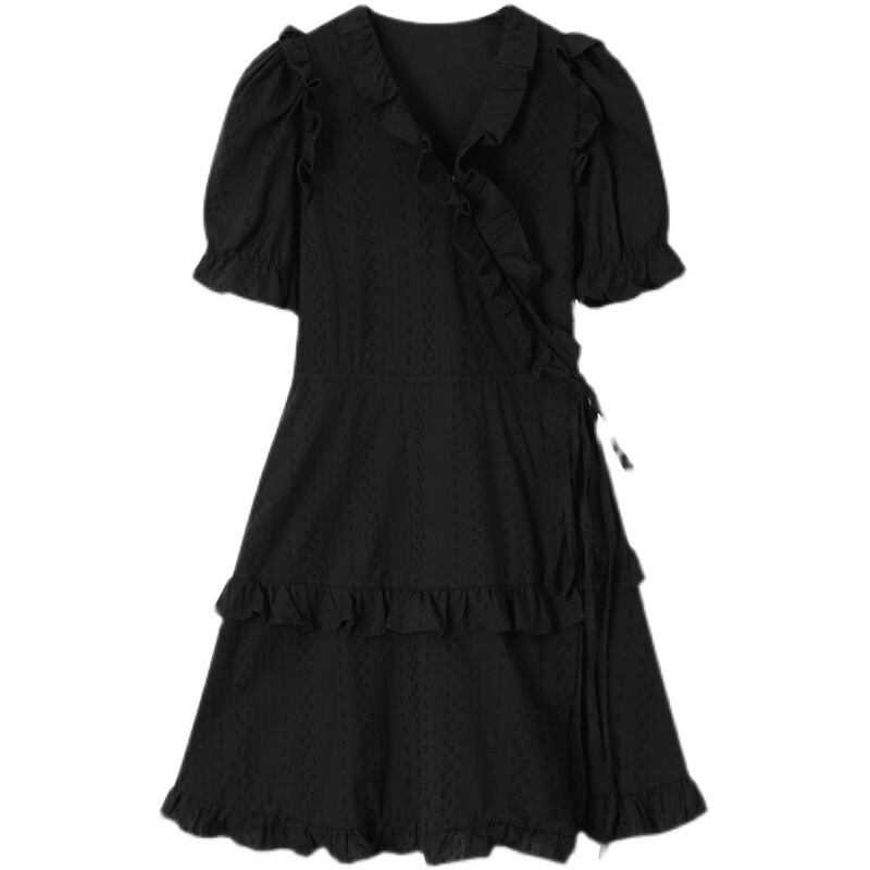 サマーVネックショートドレス 薄手ウェストラッフルブラックスカート 夏物 6/28 mi4615579228623