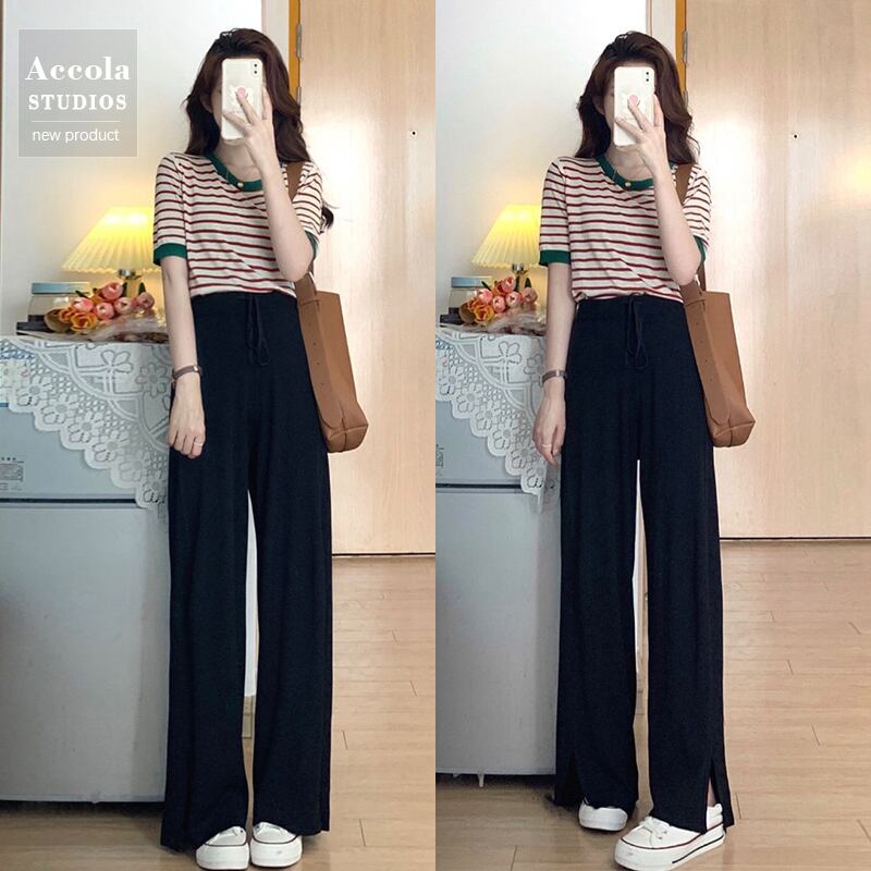 サマースタイルストライプニットトップス ワイドレッグパンツ カジュアルレディース 夏物 ワイドパンツ 6/28 mi4676939142845