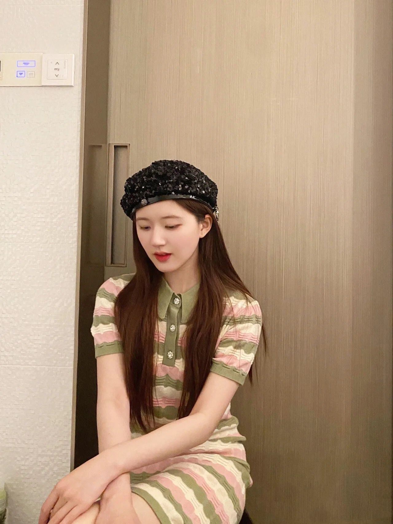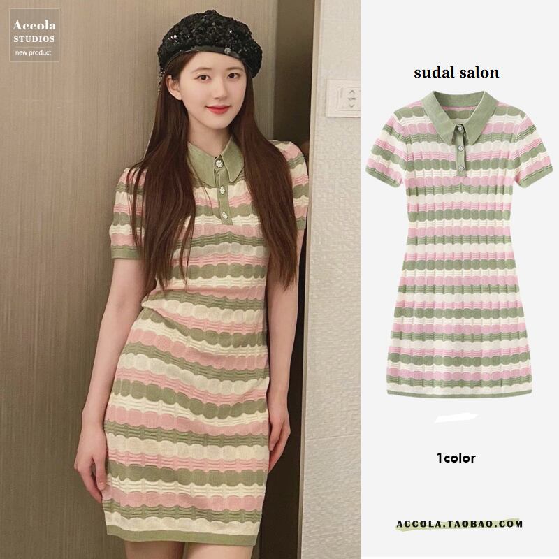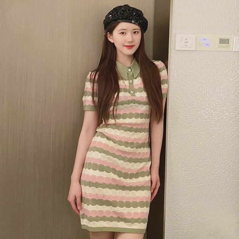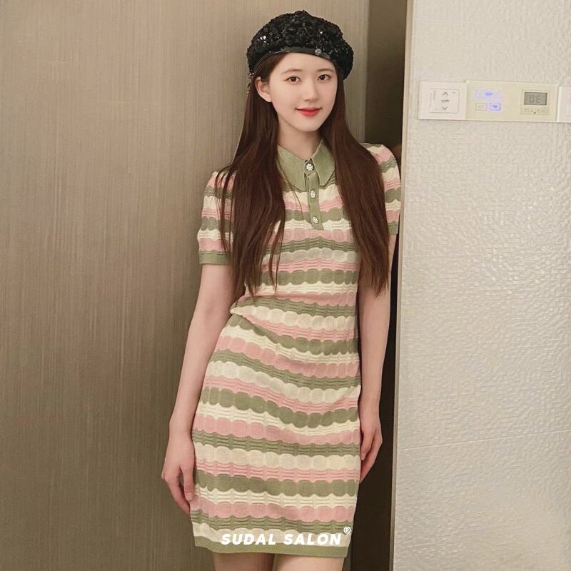 サマースタイルスリムフィットカラーニットドレス ストライプスカート 夏物 シルク 6/28 mi4659428151990
