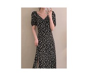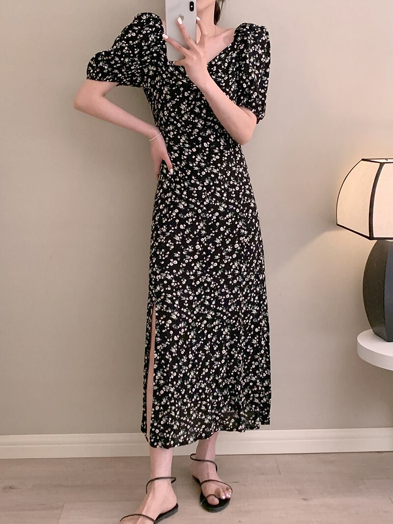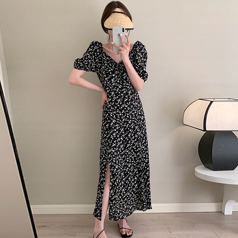Vネックウェストスリムサイドスリットフローラルドレス ロングスカート エレガント 花柄 7/20 mi4676224805566