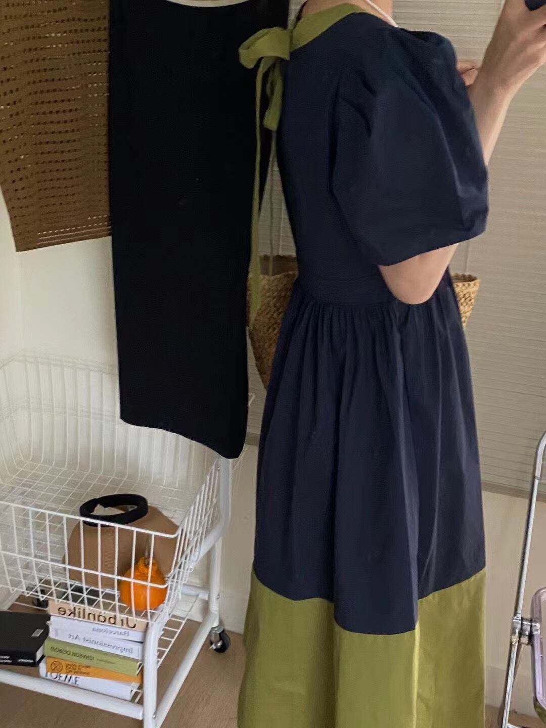 サマースタンダードカラーバックウェストスリムドレス レトロ 夏物 スクウェア ステッチ 7/20 mi4664014006523
