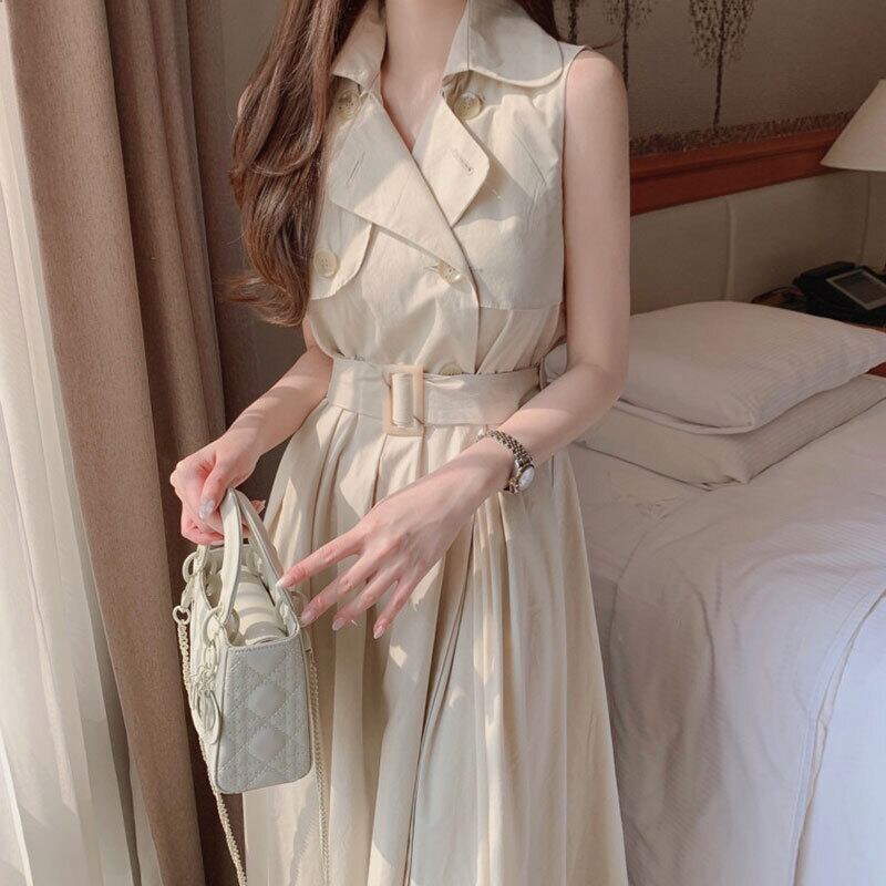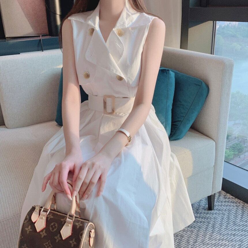 サマーカラーダブルブレストストラップ ウェストスリムノースリーブドレス エレガント 夏物 7/20 mi4687243284917