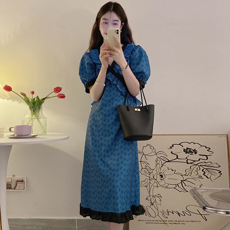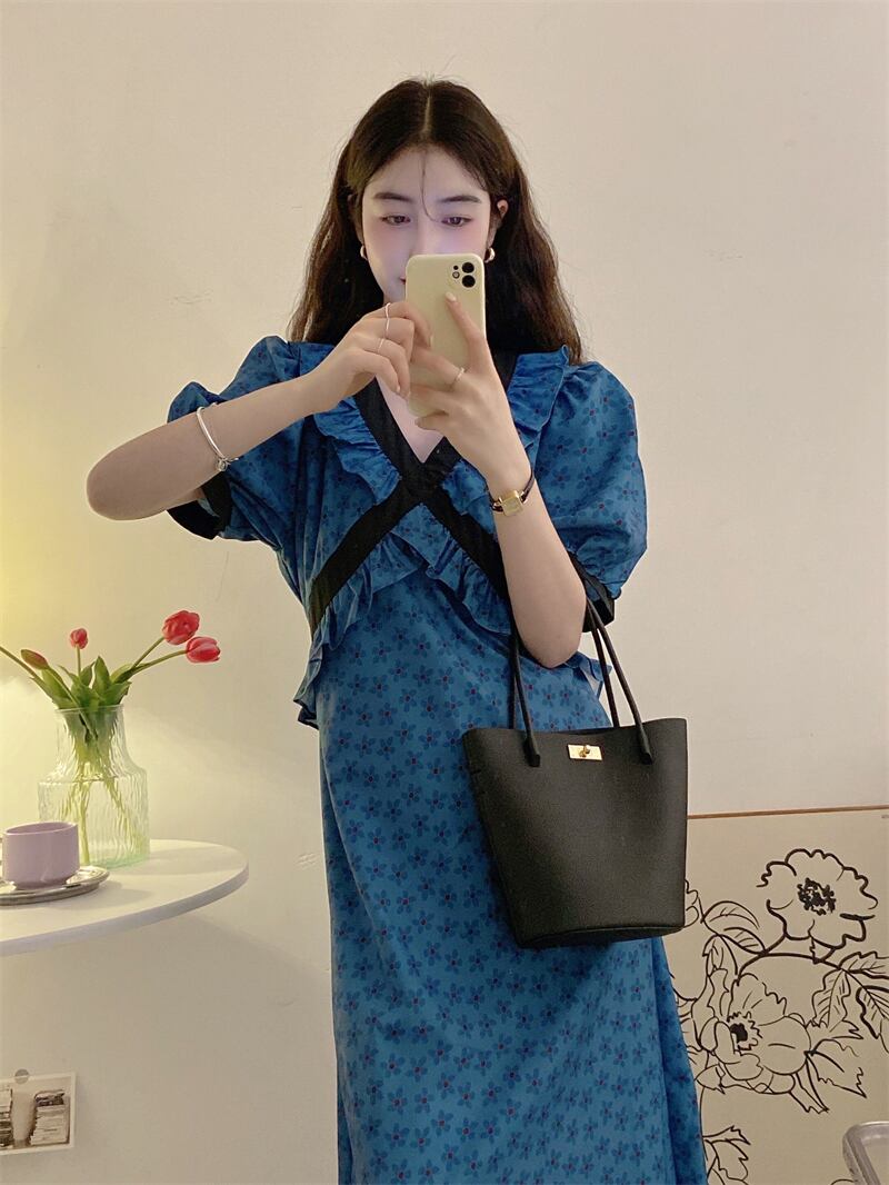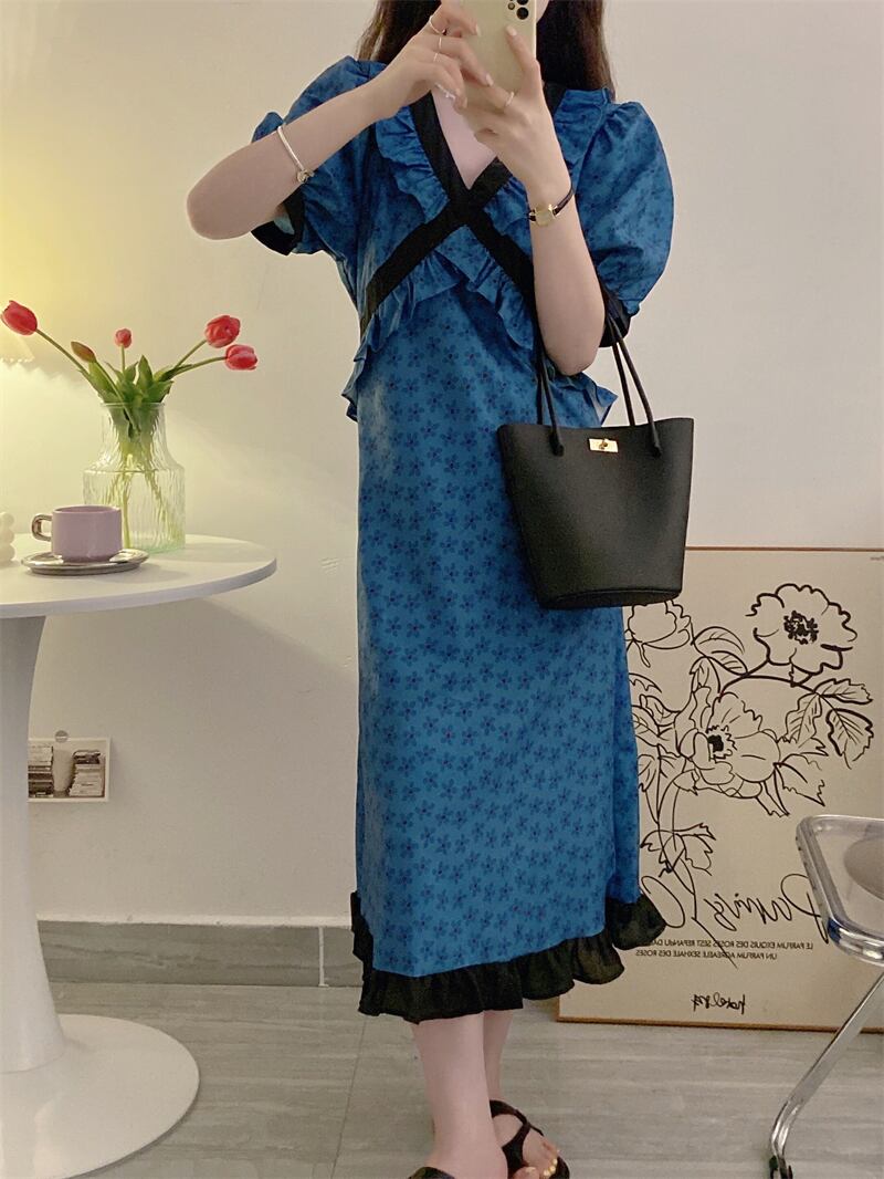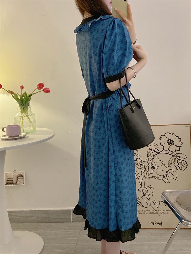 サマースタンダードVネックカラーウェストフローラルドレス レトロ 夏物 花柄 ステッチ 7/20 mi4640939198034