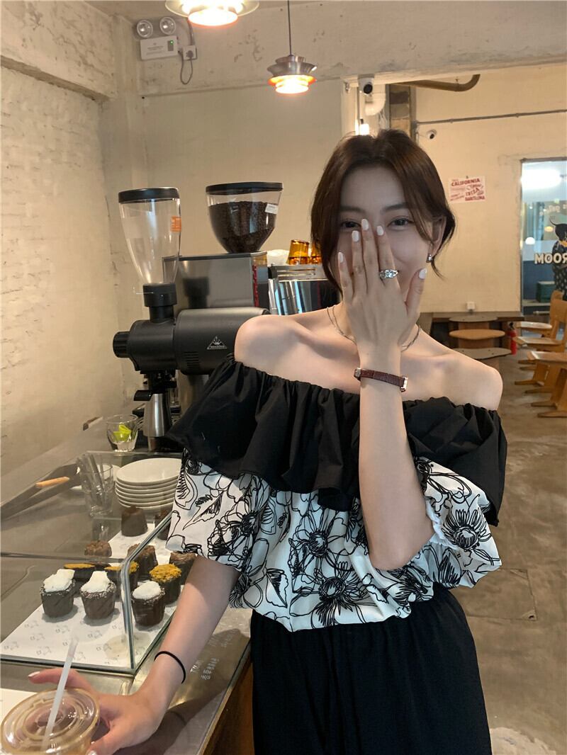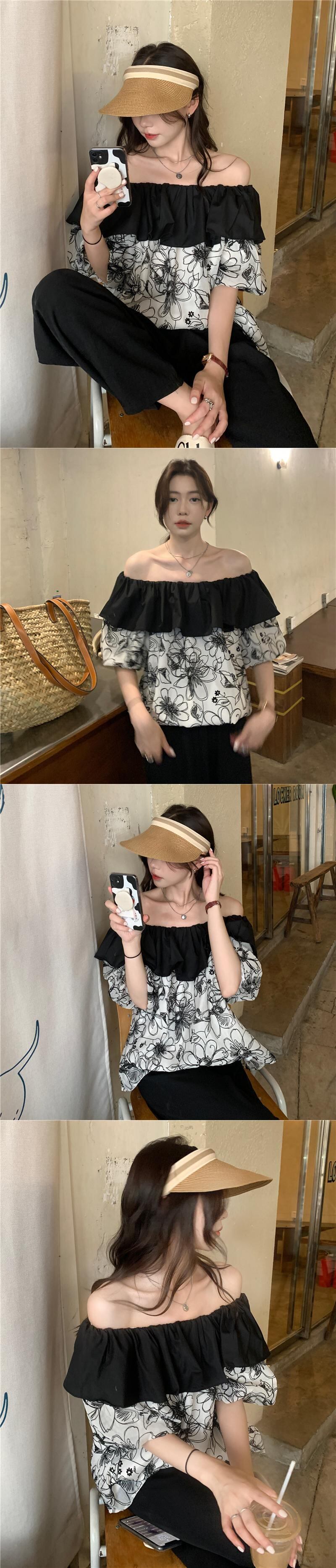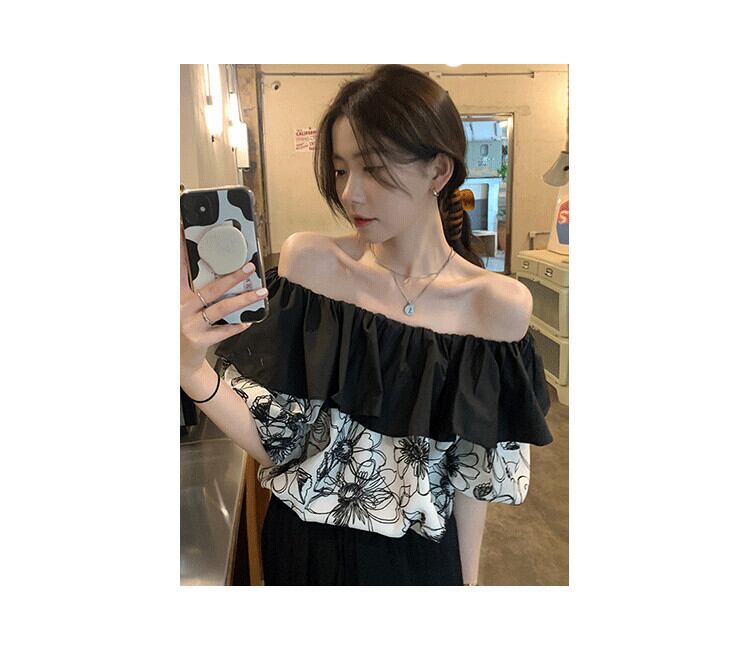 サマースタンダードカラーフリルルーズプリントシャツ レディース レトロ ラッフル 夏物 ステッチ 7/20 mi4643414547803