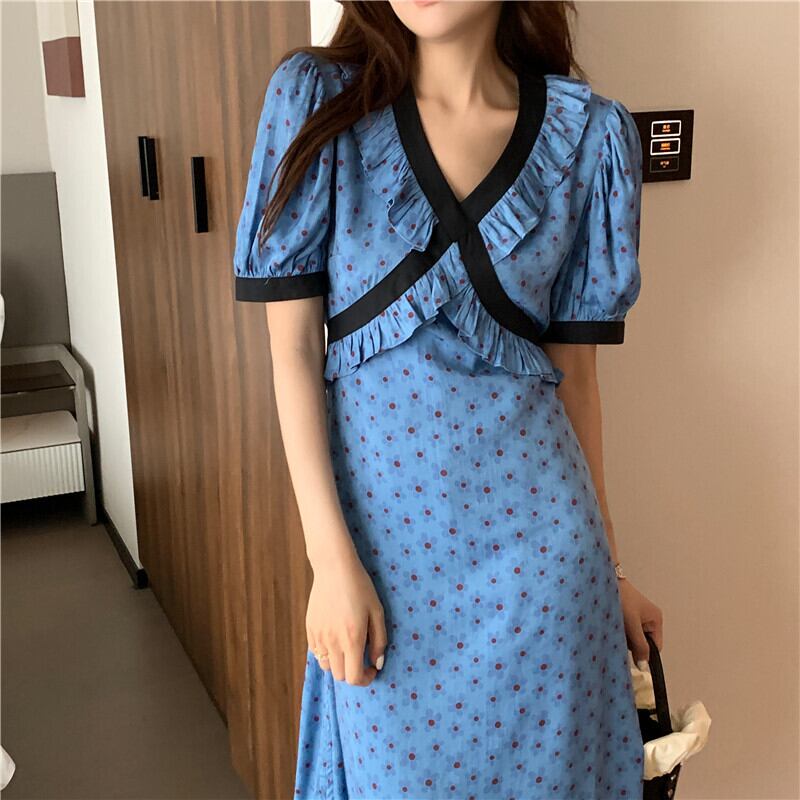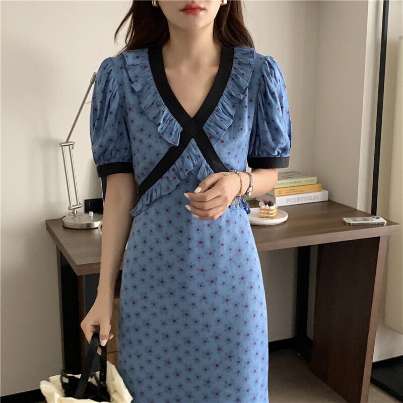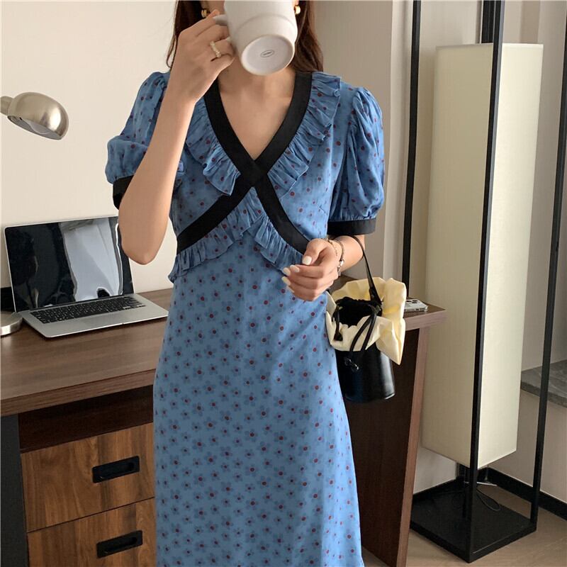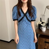 サマースタンダードスタイルVネックカラースリーブフローラルドレス レトロ 夏物 花柄 ステッチ 7/20 mi4651915815959