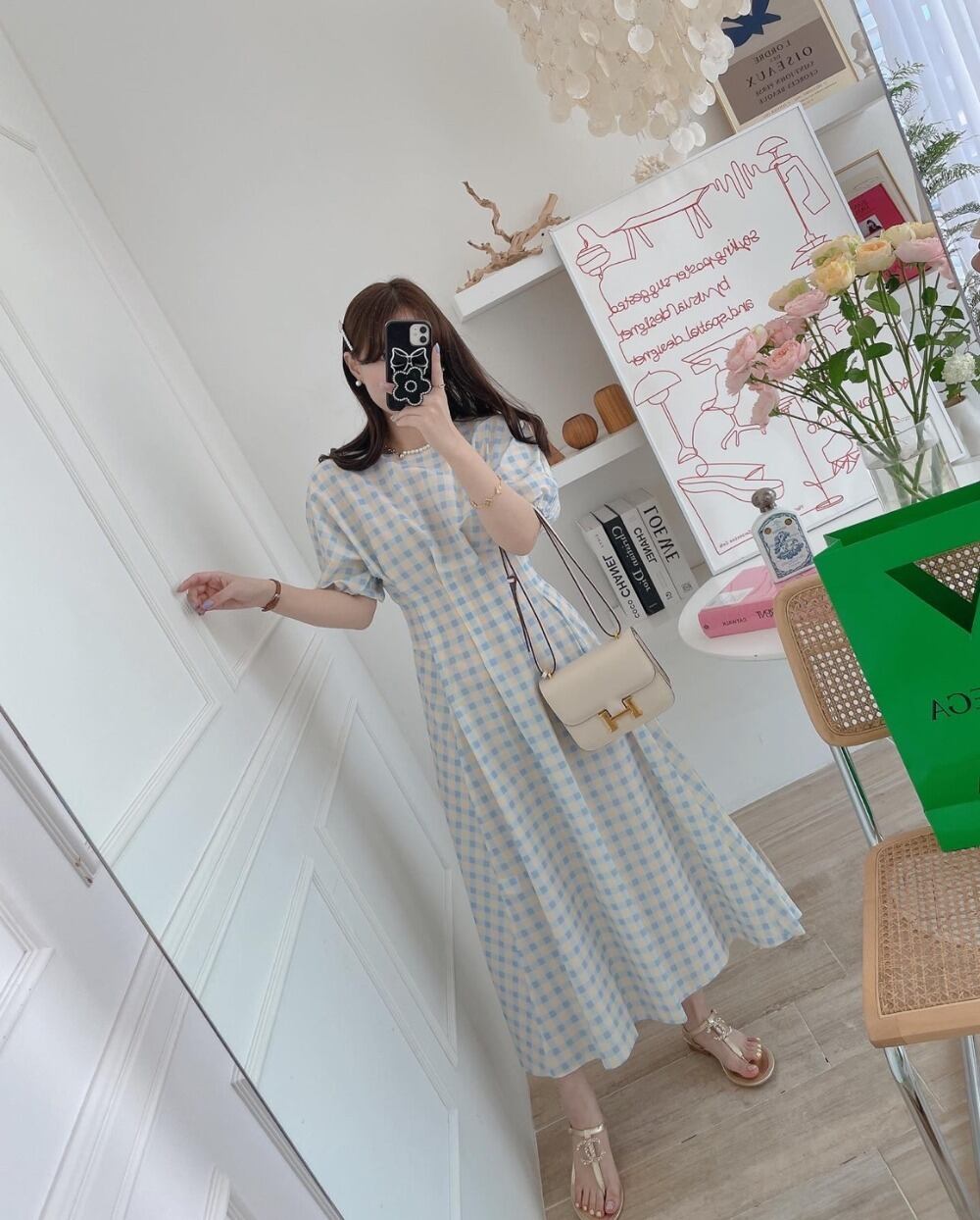 サマーラウンドネックプリーツウェスト薄手格子柄ドレス レディース エレガント 夏物 Oネック 7/20 mi4660785277097