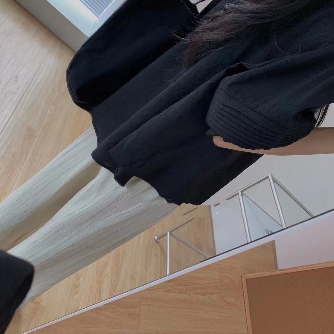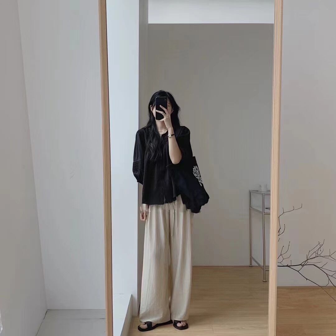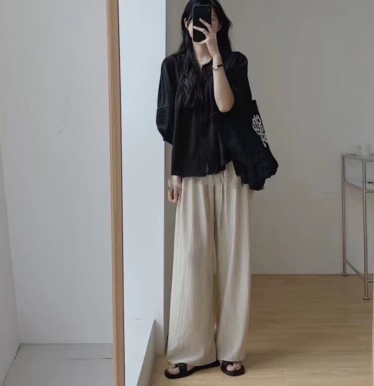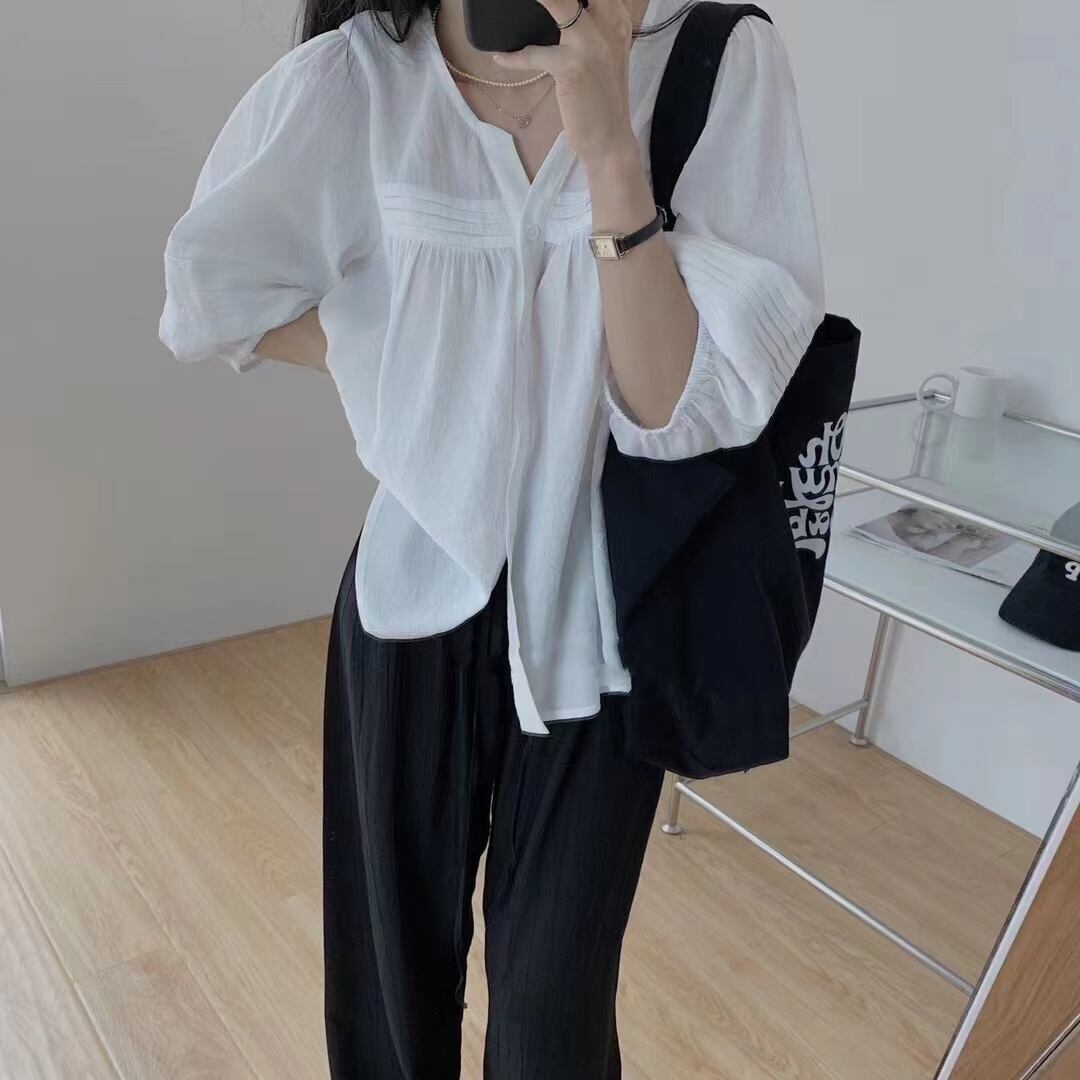 サマースタンダードラウンドネックスリーブシャツ ハイウェストウェストワイドレッグパンツ ランタンスリーブ レトロ 夏物 Oネック ワイドパンツ 7/20 mi4628680849588