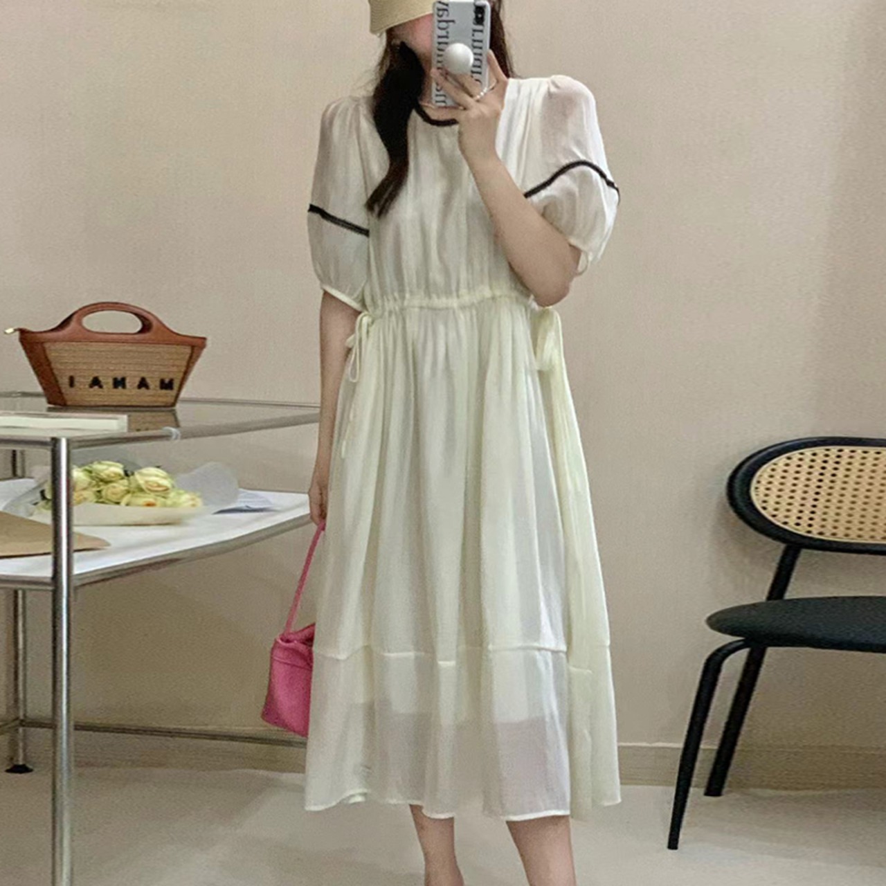サマーカラーラウンドネックプリーツウェストロングドレス レディース エレガント 夏物 Oネック 7/20 mi4676711598054