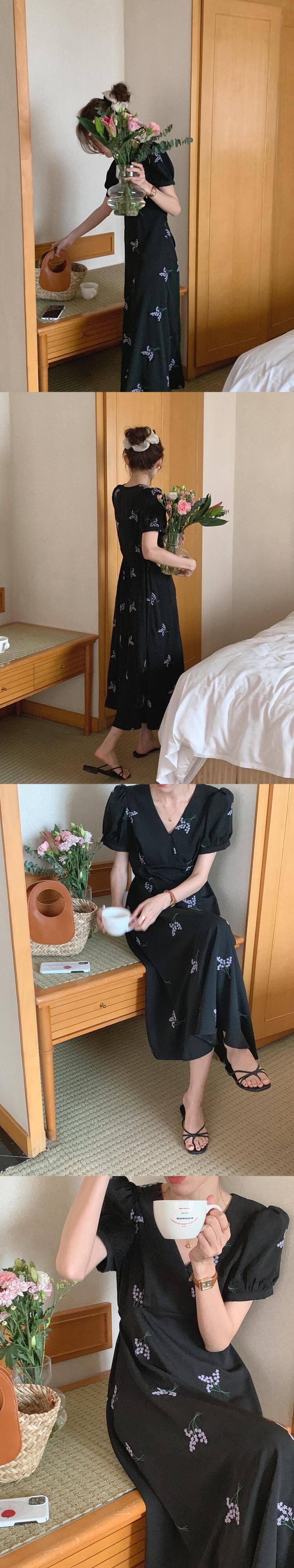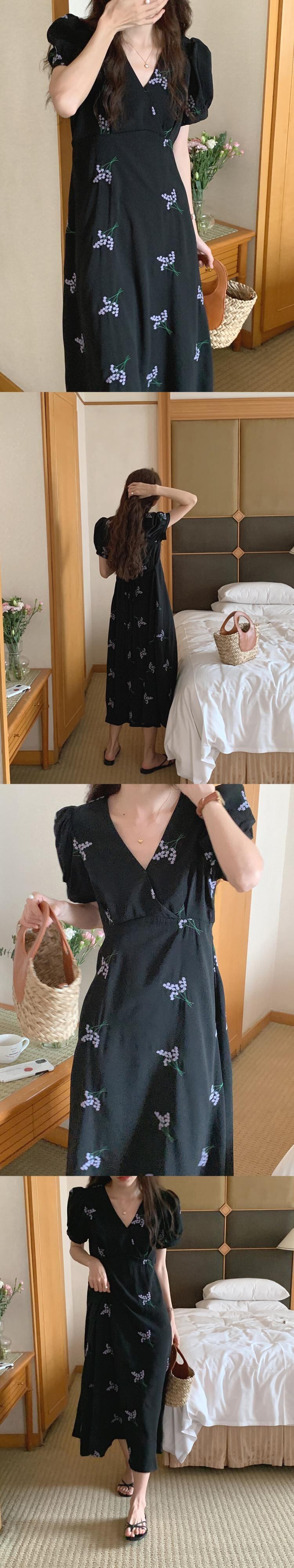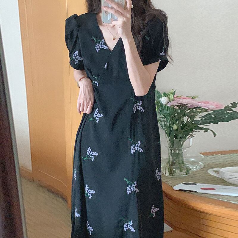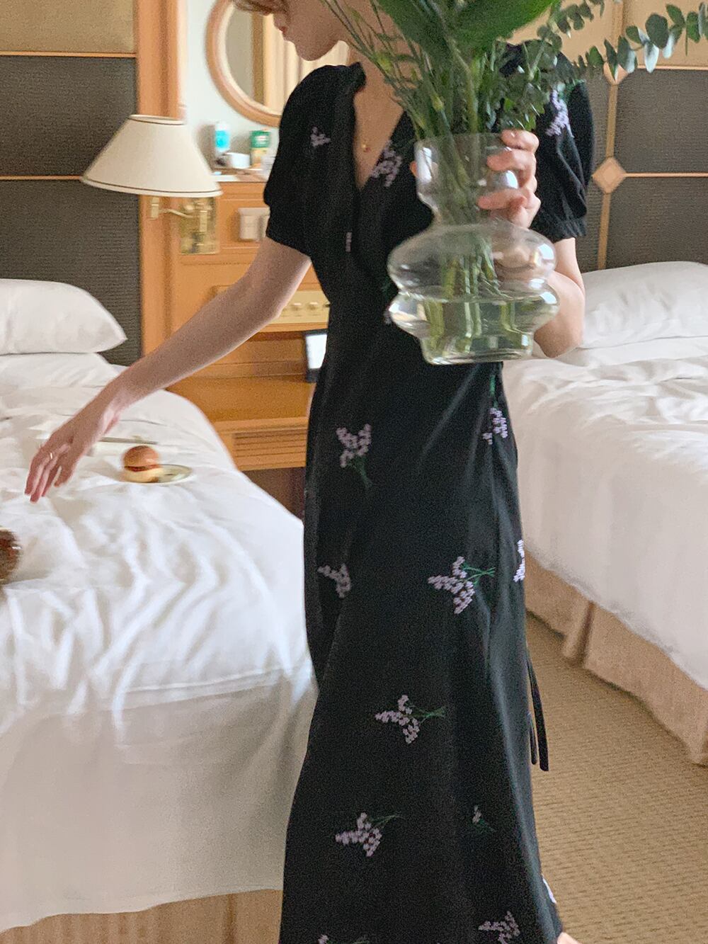 サマースタンダードクロスVネックウェストスリムスリーブフローラルドレス ロングスカート レトロ エレガント 夏物 花柄 7/20 mi4698079431408
