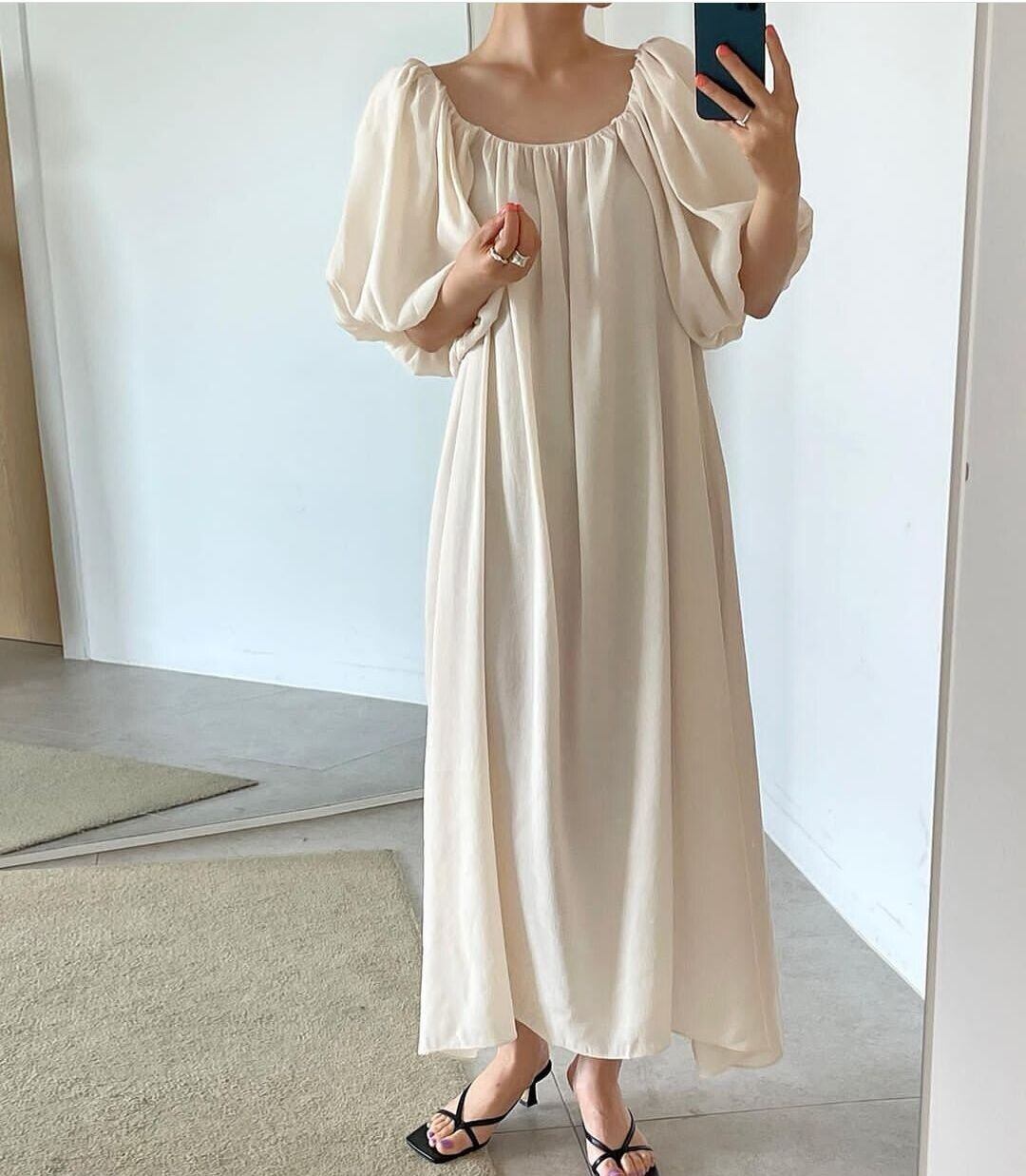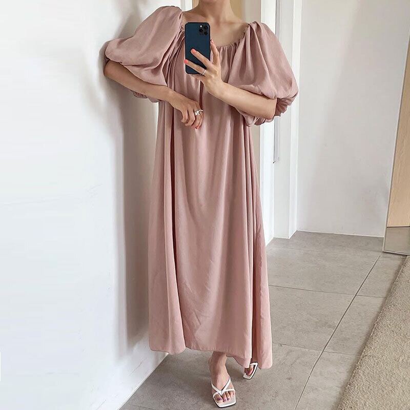 サマーカラールーズカジュアルスリーブロングドレス レディース ランタンスリーブ 夏物 スクウェア 7/20 mi4693098784887