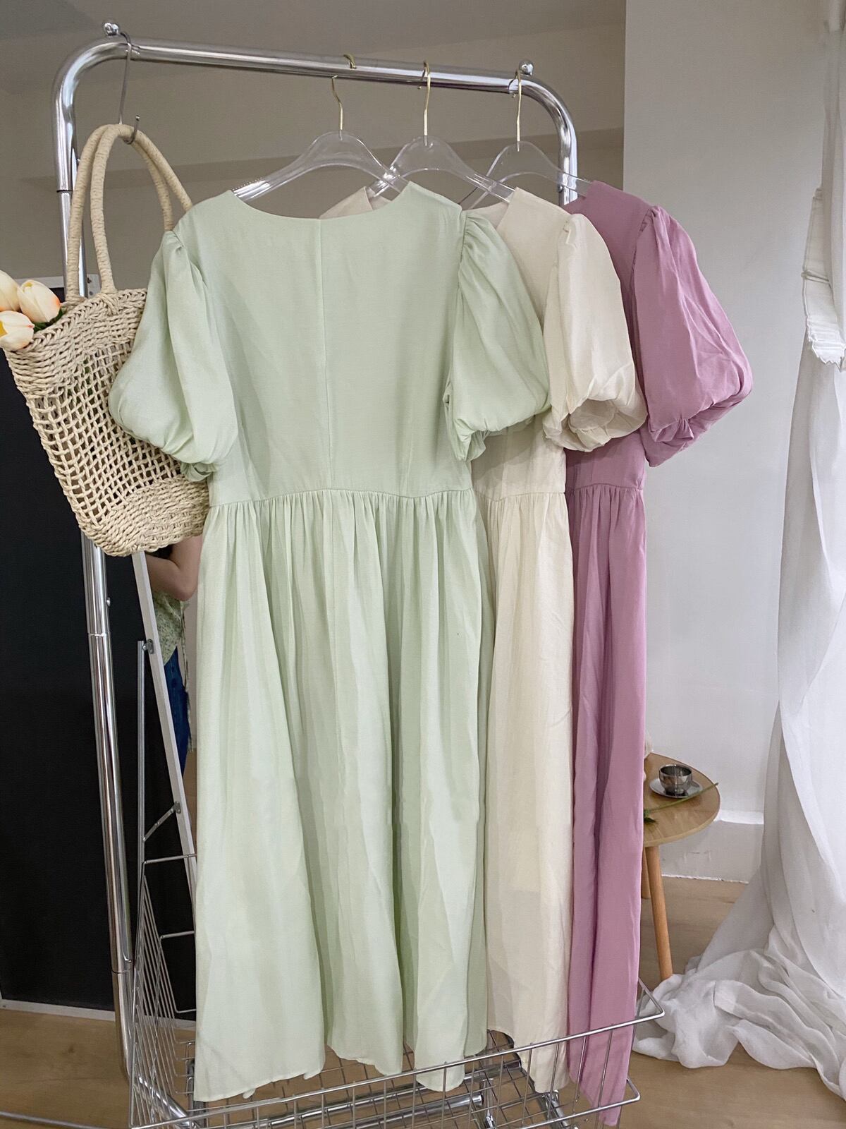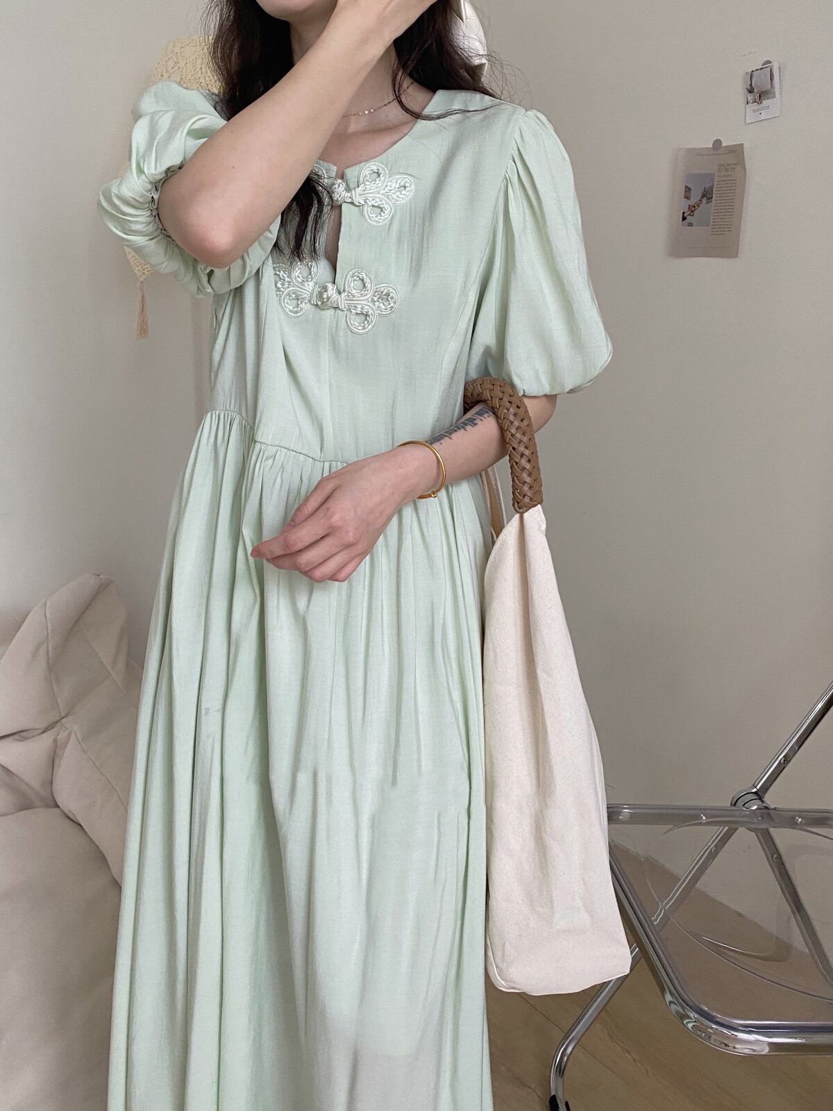 サマーラウンドネックボタンプリーツウェストスリムスリーブドレス エレガント 夏物 Oネック 7/20 mi4673807940276